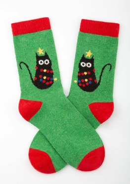 Get ready for the holidays with the whimsical Marilyn D35 Angora Socks! These wonderfully cozy socks are crafted with soft angora and a plush knit to keep your feet warm all season. The festive green knit features an adorable black cat design knit directly into the fabric—the cat is cleverly adorned with knit garlands and a star to resemble a playful Christmas tree. This quality knit-in detail makes them a charming and high-quality addition to your holiday wardrobe. They are a perfect gift or a comfortable treat for yourself.